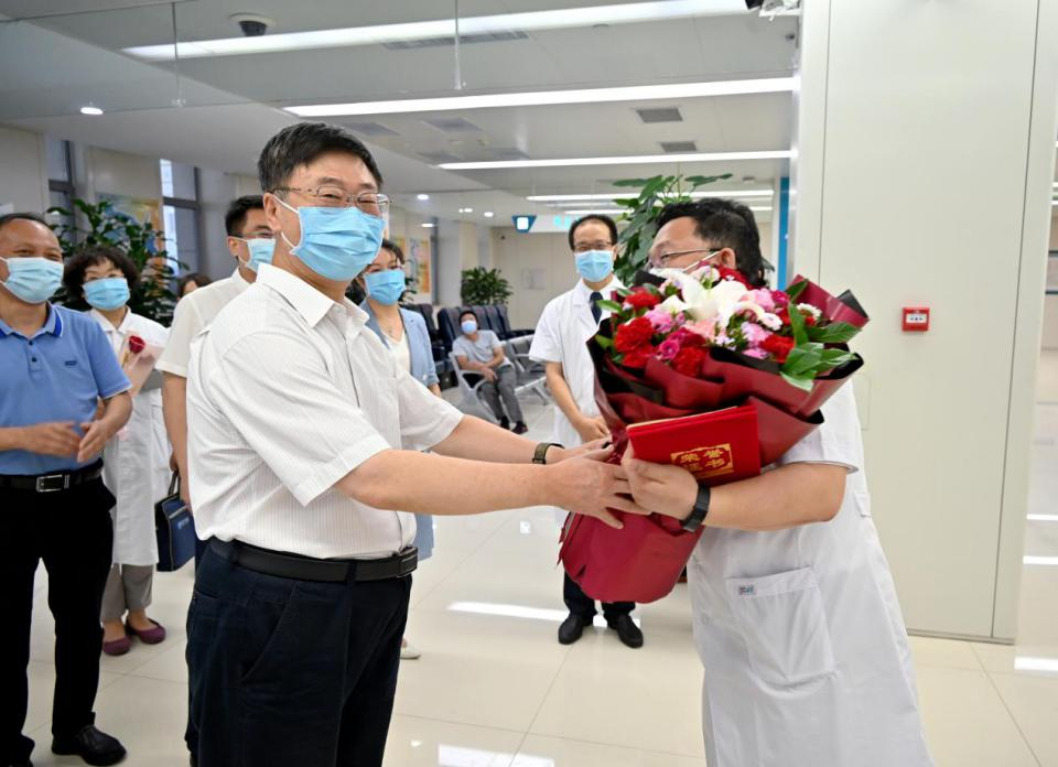 8月19日上午,在第四個“中國醫師節”到來之際,太原市衛健委主任宮殿元,副主任孫慧生、趙宏英等一行在太原市中心醫院院領導李新華、楊曉麗及相關職能科室負責人陪同下,慰問了“太原青年醫師獎”獲得者、醫務處主任馮志鵬,送來了鮮花和證書,同時也向全院廣大醫務工作者致以節日的問候和崇高的敬意。