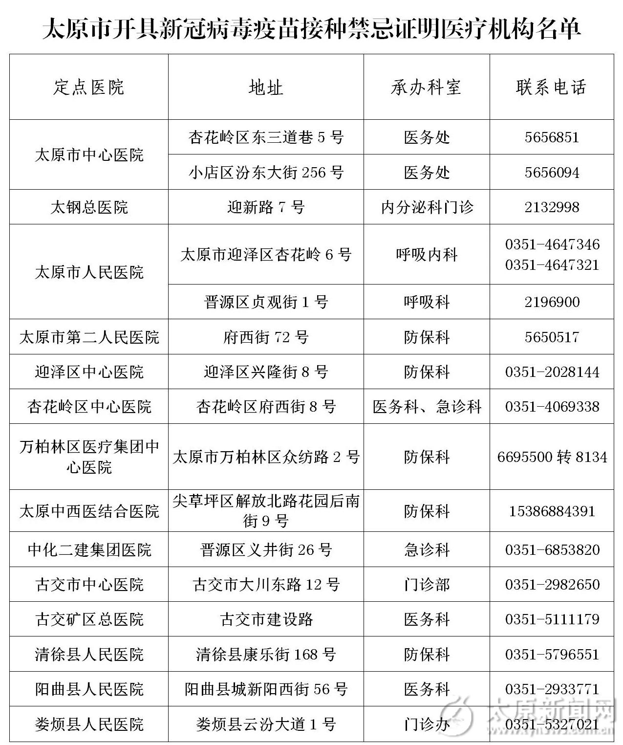 8月26日,太原市疫情防控辦下發通知,為進一步推進新冠病毒疫苗接種工作,做到適齡人群且無接種禁忌新冠病毒疫苗“應接盡接”,做好接種禁忌證明開具工作,指定14所醫療機構為開具接種禁忌證明的定點醫院,并明確了接種禁忌判定原則和開具流程。