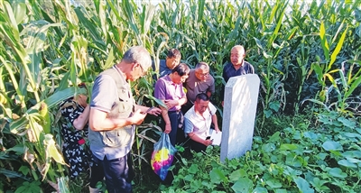 土嶺村就在縣城南邊,驅車不到10分鐘我們就來到了這里。由朱輝的侄兒王蘇錄引導,在村外的一片玉米地里,我們找到了朱輝烈士的墓。墓地已經完全被一人多高的玉米所覆蓋,拔開玉米叢,一塊墓碑顯露出來。