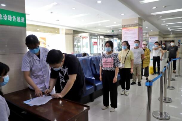 8月29日,雙塔北路迎澤區(qū)中醫(yī)醫(yī)院內(nèi),就醫(yī)患者保持“一米線”距離。張昊宇 攝