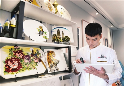 “95后”婁煩小伙劉旭峰憑借果醬畫創作,在圈內小有名氣。“果醬畫讓我大開眼界,它不僅有流暢的線條,還能畫出五彩斑斕的世界。”劉旭峰說。在酒店初次見到果醬畫,就被深深地吸引,栩栩如生的作品,讓食客贊不絕口。那次之后,只要稍有空,他都會跑到樓上看師傅作畫。他牢記每一個步驟,然后自己反復練習。每次創作前,他先要在盤上畫出白描圖,有了輪廓后,再用調制好的果醬層層分染,然后自然晾干。功夫不負有心人,在師傅的引導下,劉旭峰學得很快,風景、動物、建筑……一件件作品隨心而出。