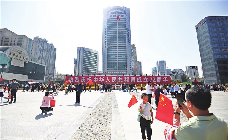十月一日,市民紛紛來(lái)到五一廣場(chǎng),與國(guó)旗合影留念,慶祝中華人民共和國(guó)成立七十二周年。韓雙喜 牛晨陽(yáng) 攝
