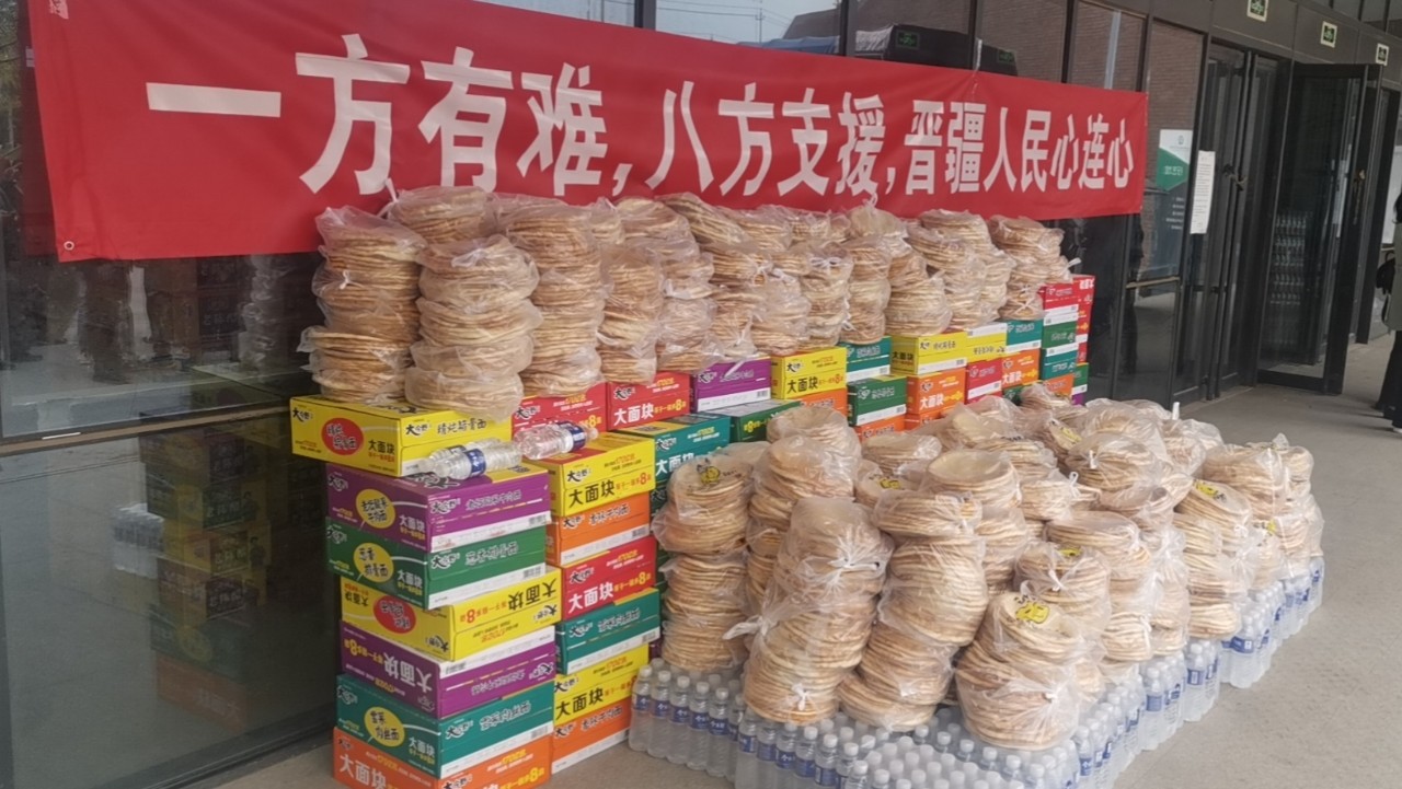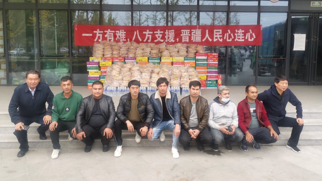 10月12日下午,一車載滿新疆馕餅、方便面和礦泉水等愛心物資的車輛駛入了清徐縣徐溝鎮安置點,這是5位在并新疆籍務工人員為該安置點送來的物資。