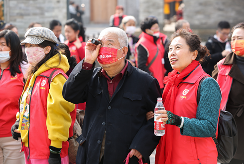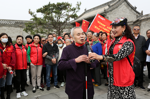 鼓樓廣場,視障讀者們情不自禁的想要用歌聲來表達(dá)心中的喜悅,自發(fā)組織合唱《人說山西好風(fēng)光》。助盲志愿者還為視障讀者錄制了微視頻,幫他們用鏡頭記錄下了這次難忘的游讀經(jīng)歷。