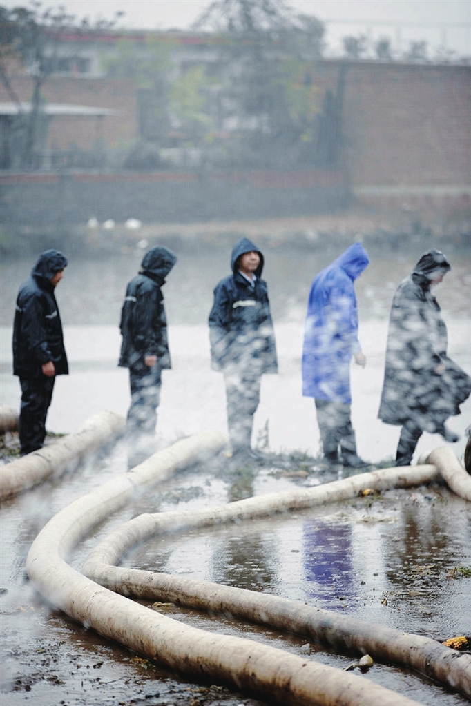 工作隊(duì)員在抽排積水。