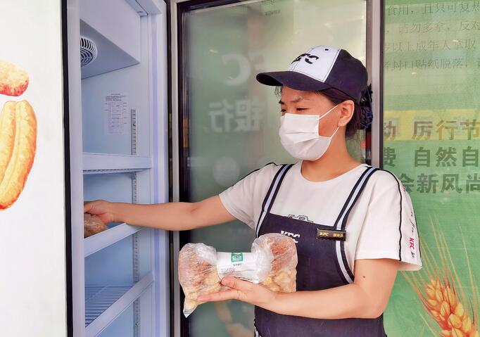 記者在現場看到,肯德基食物銀行采用冷凍形式存放,溫度在零下22至零下18度之間,以確保食品安全。考慮到取用的便捷性,餐廳把余量食物進行分袋包裝,并在包裝袋上標明產品名稱、存入日期、食用指引等信息。冰箱上面寫著“余量食物領取站”,醒目位置張貼著食品安全提示,里面詳細介紹了食用方式和注意事項, “需要重新加熱,燒熟煮透方可使用”“食品只可當天食用,且只可復熱一次”“若保鮮袋破損或者封口貼紙脫落,請勿拿取”等。在冰箱側面貼有珍惜食物、物盡其用、合理取用等字樣,倡議大家響應節儉,按需取用。在冰箱里整齊的陳列著原味雞、雞翅、華夫餅等數十袋食物,每一袋食物上都有封口簽和溫馨提示。食物銀行早上一經啟用,就有附近的環衛工人、外送小哥等市民聞訊過來有序領取餐食,肯德基餐廳的工作人員細心地為大家講解注意事項。