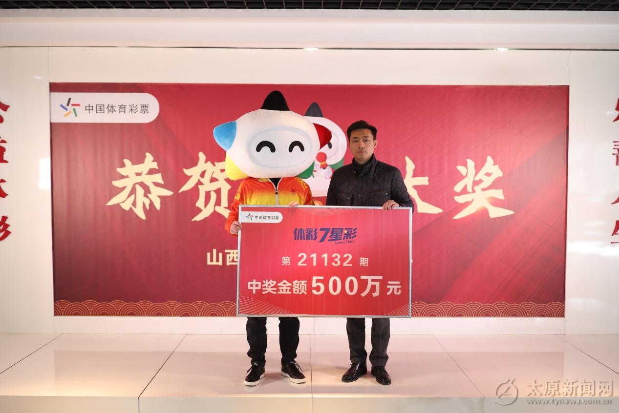 (山西省體育彩票管理中心副主任李博(右)為中獎?wù)哳C獎)