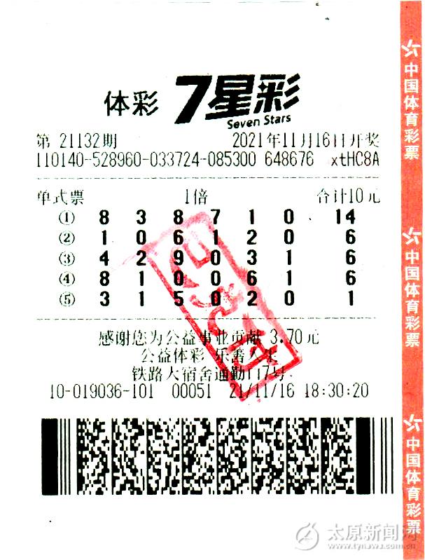 11月16日7星彩第21132期開獎,開獎號碼為“1 0 6 1 2 0+6”,我省臨汾購彩者憑借一張10元5注的單式票斬獲500萬元頭獎。這是我省今年中出的第7個500萬元以上的大獎。