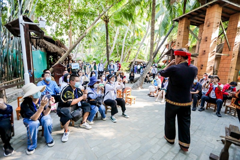 “咦,那是什么樂器?這么清脆獨特?”循著聲音,記者編輯走近一看,看到非遺傳承人正吹奏和彈奏著鼻簫、椰胡和木琴等之前從未見過的樂器。得知這個樂器是用竹子制成的富有黎族特色的邊棱氣鳴樂器,和其他用嘴吹奏的簫不一樣的鼻簫后,網媒記者編輯紛紛體驗鼻簫這一神奇的樂器。