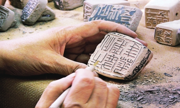 遠在仰韶和龍山文化時期,先人就在彩陶缽上刻畫符號,這是陶印最早的雛形。陶印即“陶瓷印章”,是中國傳統(tǒng)篆刻藝術(shù)與陶瓷藝術(shù)“有機融合”的藝術(shù)形式,是在未燒制好的陶坯上或在已燒制好的陶或瓷上刻印。