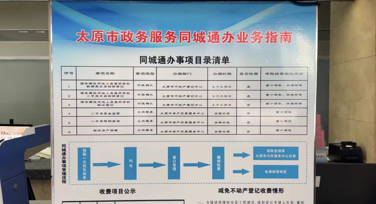 為扎實開展“我為群眾辦實事”實踐活動,提升我市政務服務效能,太原市政務服務中心于2021年底在我市六城區全面推開“同城通辦”。市民在辦理不動產登記、房產交易、社保等關系居民的熱點事項時,不用跑遠路到市級政務服務中心,可以選擇去就近城區政務服務大廳的“同城通辦”窗口辦理。