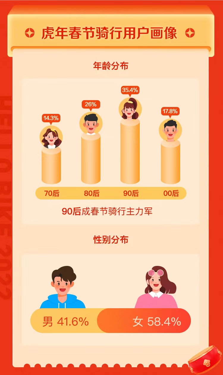 在騎行用戶畫像中,報告顯示,春節(jié)騎行訂單女性用戶占比58.4%高于男性用戶的41.6%。90后用戶貢獻春節(jié)騎行訂單35.4%,成為騎行主力軍。80后用戶緊隨其后,春節(jié)騎行訂單占比26%。