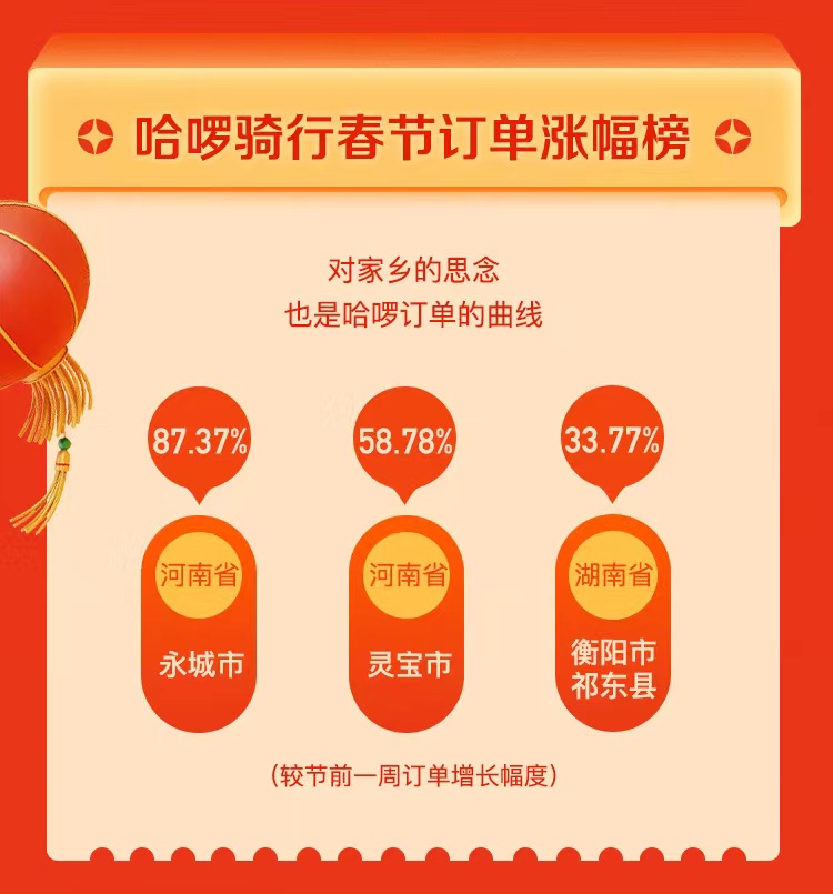 國內疫情防控成果顯著的背景下,返鄉(xiāng)過年群體帶火了低線城市騎游出行。虎年春節(jié)假期期間,三線及以下城市騎行訂單迅速增長,出現(xiàn)了很多黑馬城市。相較節(jié)前一周,哈啰單車、助力車騎行訂單綜合來看,河南永城市訂單增長率為87.37%,河南靈寶市訂單增長率為58.78%,湖南省衡陽市祁東縣訂單增長率為33.77%。返鄉(xiāng)過年客流疊加本地居民出行需求,讓春節(jié)期間的共享兩輪出行十分火熱。