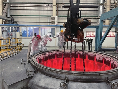 齒傳熱處理工藝攻關團隊的項目負責人張一坤和質控員魏飛,身著具有隔熱、防輻射作用的銀亮防護服,戴著面罩,守在直徑4米、深度2米的加熱爐最前端,爐光映紅了兩人的臉。熱浪撲面而來,雖已全副武裝,體感溫度仍在40℃以上。他倆一邊盯著爐口,一邊指揮吊裝人員,將形似超大號秤砣的圓形芯軸緩緩放入爐內,這個足有6噸多重的合金實心芯軸,被嵌入齒輪的空心部分,將齒輪牢牢支撐,以盡可能減少齒輪在淬火時發生變形。