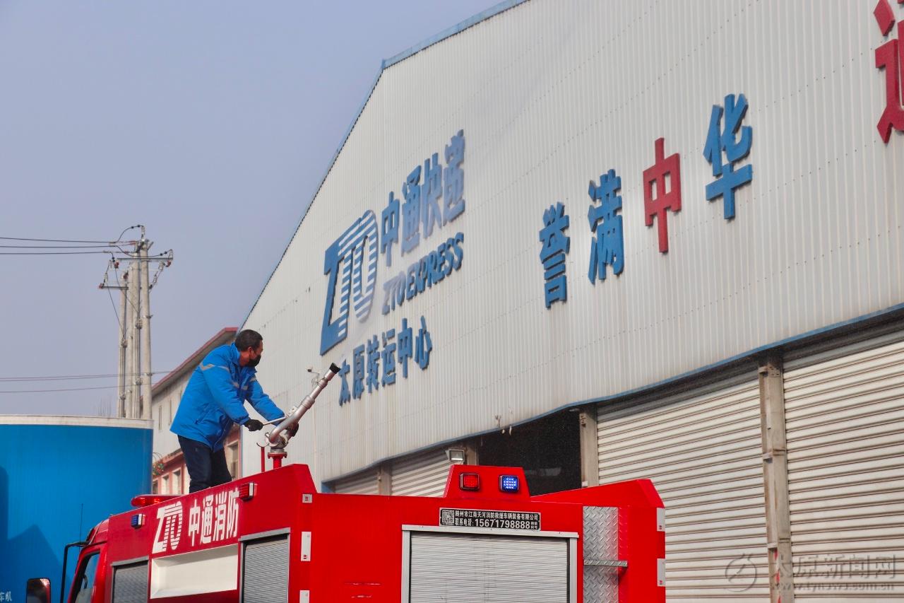面對疫情防控,承擔了大量快遞分揀“重任”的分撥中心,既要確保寬敞的室外場地每日有效消毒,同時又不能延誤快遞運輸車輛的往來作業。對此,山西中通巧用消防車,在水罐內裝滿消毒液,把消防車上的載水連接上機動泵,再裝配噴霧水槍,消防車就可以一邊行駛,一邊通過噴霧水槍進行消毒作業。
