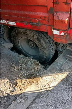 近日,太原城管指揮中心信息采集員,在迎澤區東太堡片區巡查時,發現一輛重型貨車后輪陷入雙塔南路的人行便道上,將地磚路面軋出塌坑。采集員立即上前查看路面病害狀況,并上報城市綜合管理服務平臺。經勘查,便道塌坑面積約兩平方米,深40余厘米,貨車半個車輪車胎陷入塌坑,車廂出現傾斜,倚靠在路邊圍擋上。