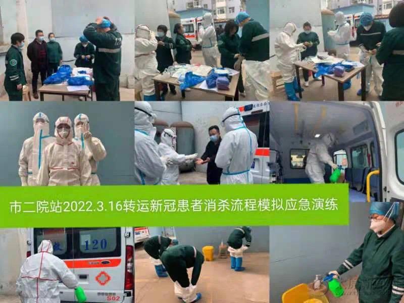 2022年3月15日至17日,太原市二院急救站早交班會后組織全站職工分組依次進行穿脫防護服、配制含氯消毒液、疫情防控消殺流程的應(yīng)急模擬實戰(zhàn)演練。