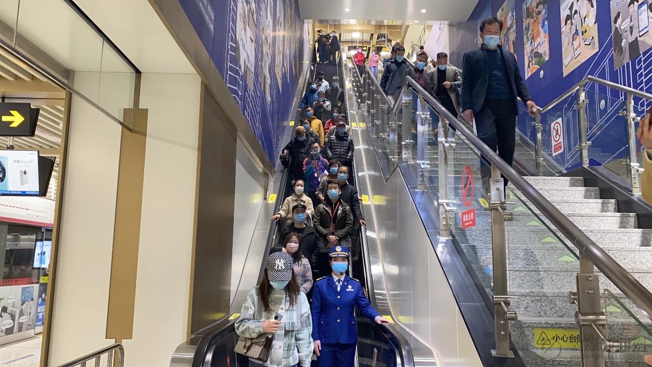 3月26日,在太原地鐵2號線大南門站D口,工作人員正在給大家講解安檢、車票使用、候車、乘車等注意事項及文明乘車內容,號召廣大市民乘客遵守軌道交通運營秩序,保障軌道交通運營安全。