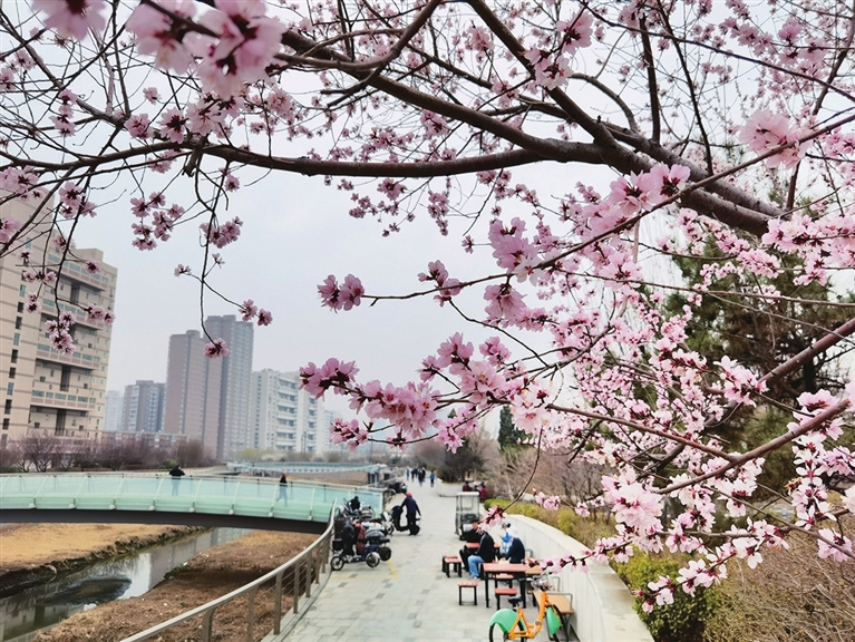 “啥時候建起了這么多小游園!”這一路,他們發現了更多“新大陸”。南沙河沿岸的小游園里,灌木叢已冒出新綠,桃花、杏花、迎春花盡情綻放。被風吹動的花朵旋轉飄下,李曉燕不由得蹲身撿起。遠遠望去,南沙河兩岸已籠在嫩綠中,粉色、白色的花朵掩映,平添一份浪漫。