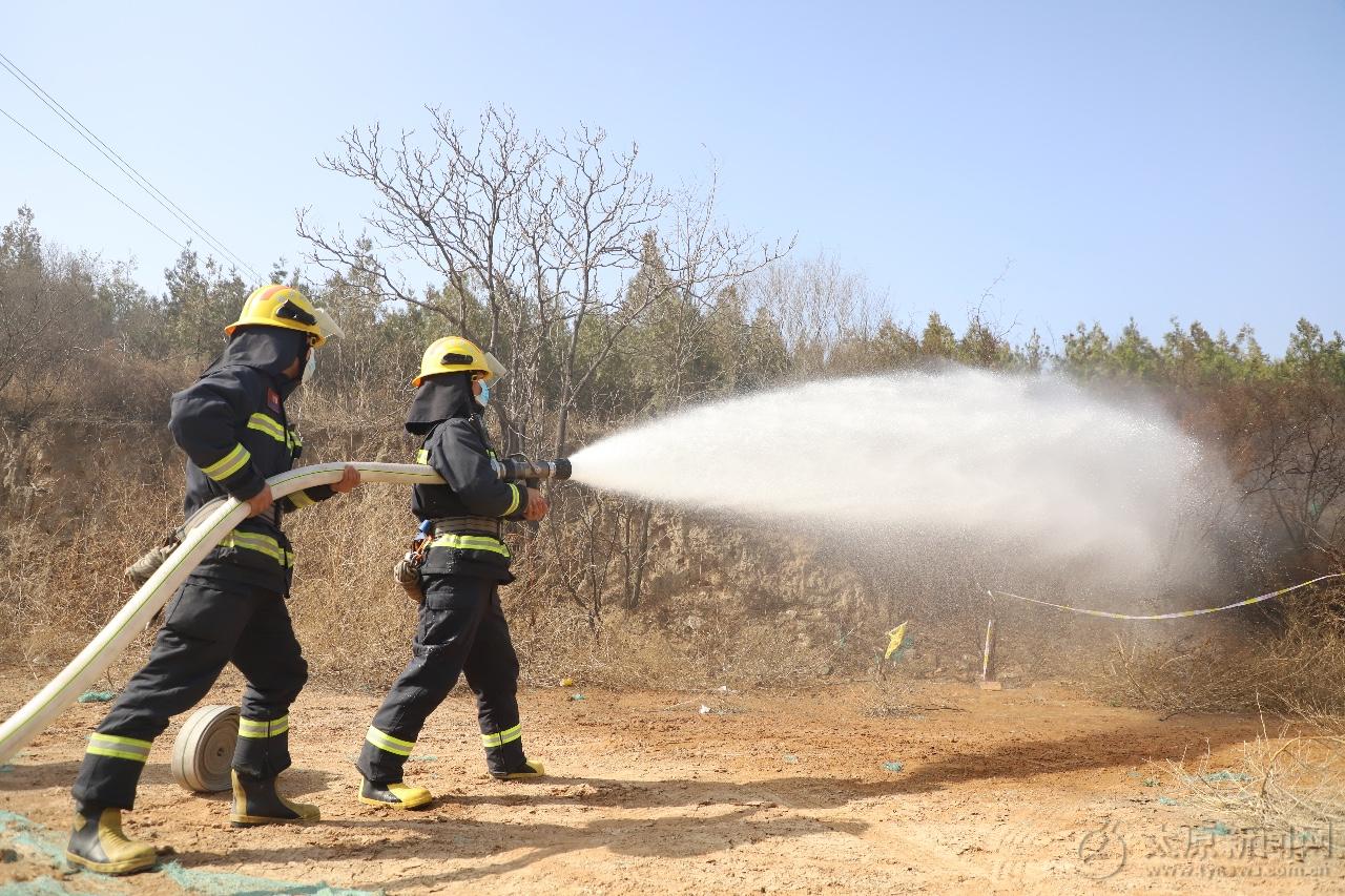 3月30日,小店區在東山五龍城郊森林公園北側黑駝村舉行2022年森林火災應急救援演練。