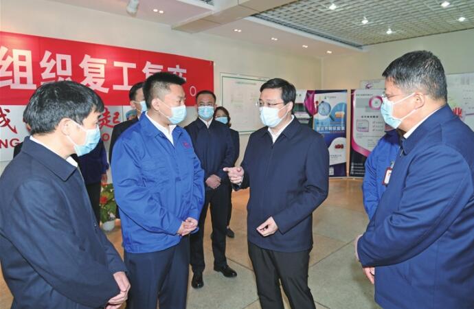山西太原藥業有限公司科學防控、規范運行,積極推動復工復產。韋韜來到這里,聽取晉源區統籌復工復產和疫情防控工作匯報,詳細了解太原藥業疫情期間閉環管理、環境消殺等措施落實情況,認真詢問企業藥品研發、生產經營、發展規劃等,并深入小容量注射劑生產車間,沿生產線實地察看洗消、灌裝、質檢、包裝等工藝流程,勉勵企業加快上市步伐,建立現代企業制度,提升科學管理水平,加大科技研發力度,打造拳頭產品、太藥品牌。他還叮囑有關負責同志要積極幫助解決用地、擴能等實際問題,全力支持企業發展壯大。