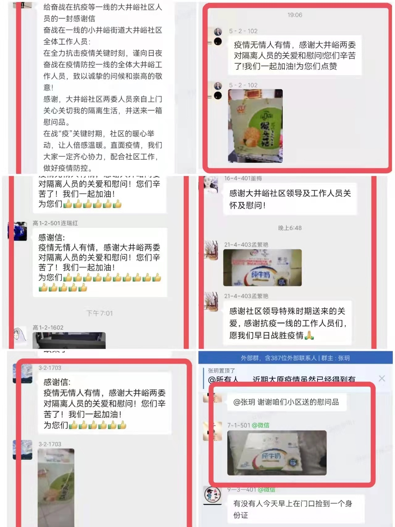 4月27日下午,萬(wàn)柏林區(qū)大井峪社區(qū)兩委成員帶領(lǐng)網(wǎng)格員深入轄區(qū)小區(qū),以“無(wú)接觸”的方式看望慰問(wèn)17戶居家隔離居民,并為他們送上牛奶、餅干等生活物資。