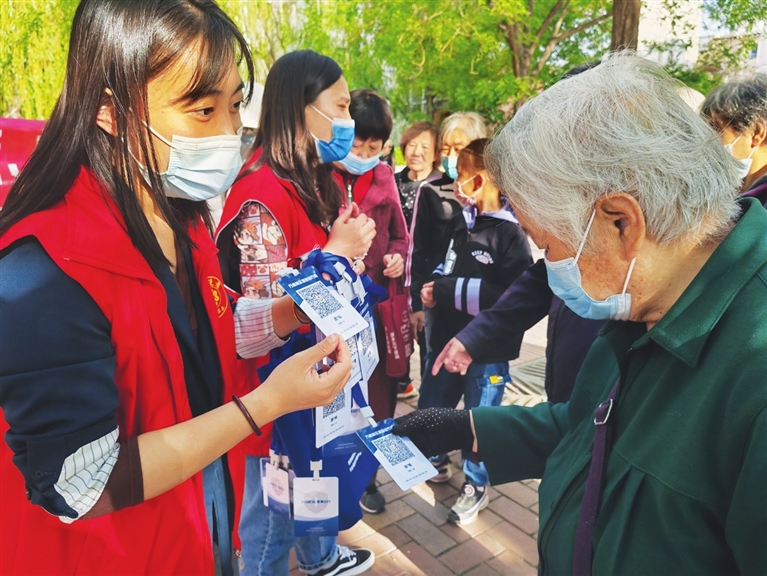 圖為南內環西街社區工作人員向老年人介紹“愛心出行碼”的申請和使用方法。