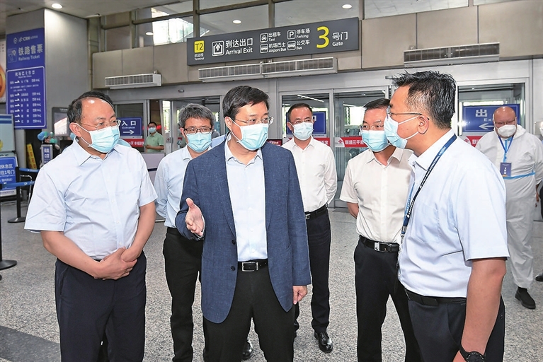 韋韜在督導檢查中強調,當前,國內疫情防控形勢依然嚴峻復雜,特別是暑假將近,學生返鄉即將迎來高峰,外防輸入壓力仍然很大。要嚴把關口,把外防輸入作為重中之重,強化交通卡口“第一時間、第一落點”管控,全力守好境外入并人員、中高風險區返抵并人員、冷鏈非冷鏈物流、進口水果、寄遞物流等輸入關口。要嚴密舉措,堅持“對外嚴防死守、對內定期篩查”,嚴格執行測溫、掃碼、查證、戴口罩“四要素”,落實雙人查驗制度,點對點、人盯人做好轉運,確保來并返并人員全程納入閉環、管控到位。要嚴防風險,根據形勢變化及時完善工作預案,對疫情防控各環節流程進行全面排查,做好查缺補漏,補齊工作短板,不斷提高防控工作的精準性、有效性。要嚴格責任,強化“四方責任”,落實機場中轉專班縣區輪值制度,做到守土有責、守土負責、守土盡責,努力實現疫情防控和經濟社會發展“雙戰雙贏”,以優異成績迎接黨的二十大勝利召開。