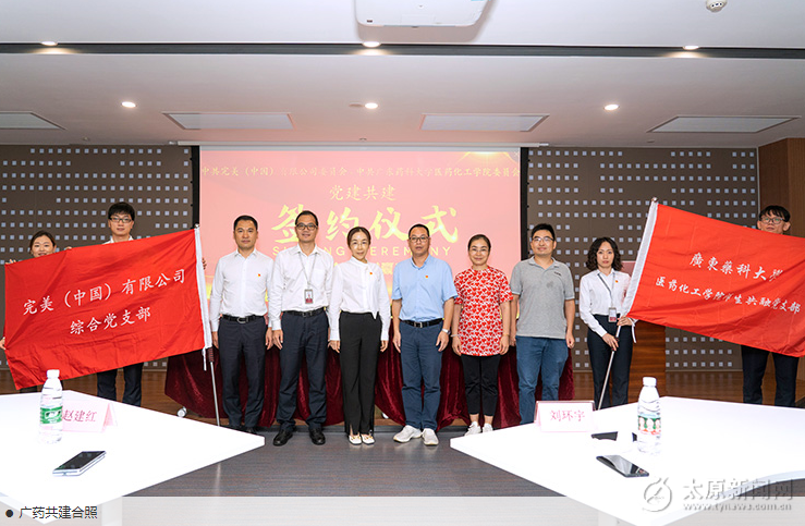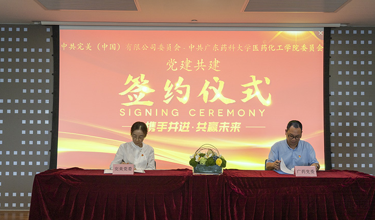 6月23日,廣東藥科大學醫藥化工學院師生共融黨支部同完美(中國)有限公司黨支部舉行結對共建簽約儀式,中共完美(中國)有限公司黨委書記趙建紅女士,師生共融黨支部書記劉環宇以及兩個支部黨員代表一起出席活動。