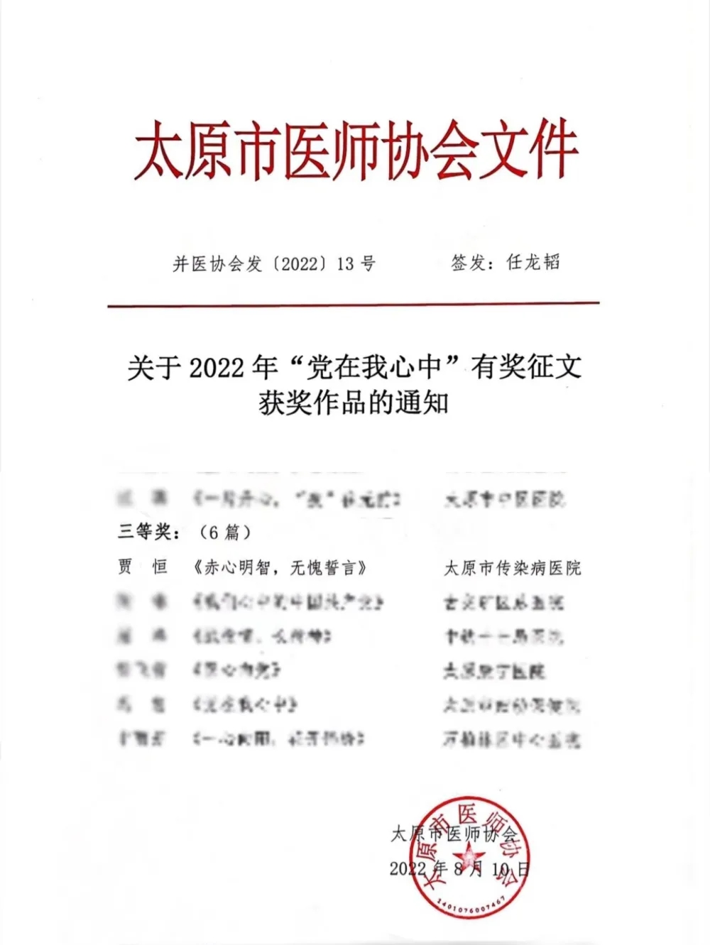 ?8月19日是第五個中國醫師節,2022年以來,太原市第三人民醫院全體醫務人員不斷在各個戰線踐行著自己的光榮使命。他們奮戰在抗疫一線,用堅韌和熱血為并州人民鑄就防疫長城;他們堅守于自身崗位,用高超的醫德醫技為全省人民創建“廉”花盛開的就醫環境;他們立足于學術研究,用刻苦鉆研的精神為臨床醫學的發展做出積極貢獻......在全國上下滿懷信心迎接黨的二十大勝利召開之際,太原市第三人民醫院隆重開展第五個中國醫師節系列慶祝活動,為推動醫院高質量發展添磚加瓦。