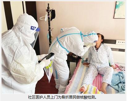 理工大社區合理設置了兩個臨時核酸檢測點位,給居民提供“零距離”的暖心服務。10月5日一大早,居民李女士打電話給社區工作人員:“我的腿骨折了,只能臥床休息,到核酸檢測點不方便,希望得到社區的幫助。”聞訊后,社區立馬為其開通了“綠色通道”,聯系并協調醫護人員入戶采樣。從打電話反映情況到核酸采樣結束,全程快速,這讓李女士感動不已。