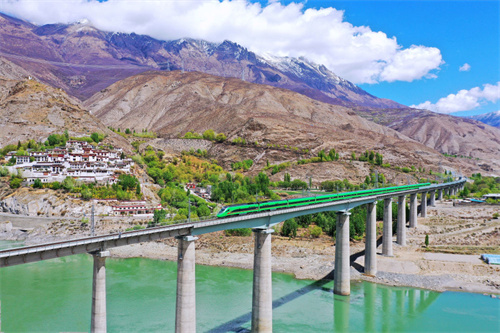 復興號列車行駛在西藏朗縣境內(2022年4月14日攝)。新華社記者 覺果 攝