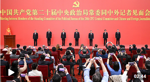 在中國共產黨第二十屆中央委員會第一次全體會議上當選的中共中央總書記習近平和中共中央政治局常委李強、趙樂際、王滬寧、蔡奇、丁薛祥、李希,23日中午在人民大會堂同采訪中共二十大的中外記者親切見面。