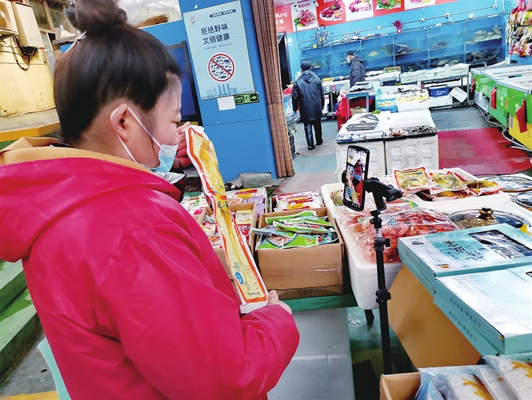 “家人們,發(fā)福利了,真空包裝的深海黃花魚35元一條,快來(lái)?yè)屬?gòu)。”臨近中午,市場(chǎng)里的人流量多起來(lái),顏現(xiàn)芳趕快將手機(jī)支架支在貨攤前,在抖音直播間開啟線上線下同步賣貨模式。循著她的聲音,現(xiàn)場(chǎng)不少顧客迅速“圍觀”挑貨,線上銷售也跟著沾光,“家人們”紛紛向主播了解商品信息。