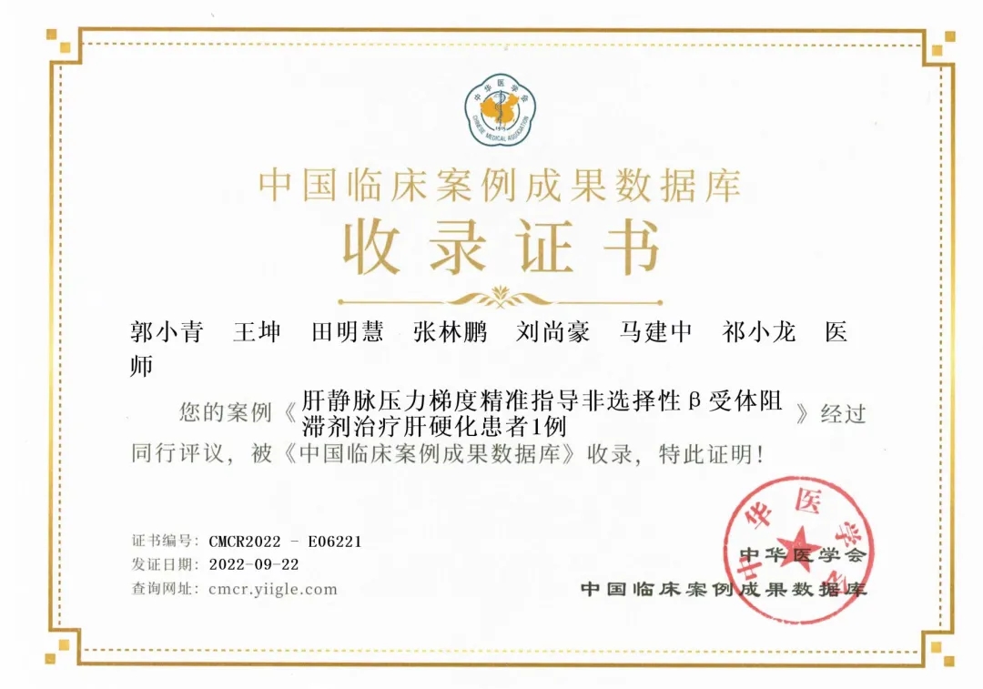近日,中華醫學會公布了“全國優秀臨床案例”遴選結果,太原市第三人民醫院肝病二科主任、郭小青主任醫師《肝靜脈壓力梯度精準指導非選擇性β受體阻滯劑治療肝硬化患者1例》經過嚴格篩選及同行評議脫穎而出,成功入選“中國臨床案例成果數據庫”。