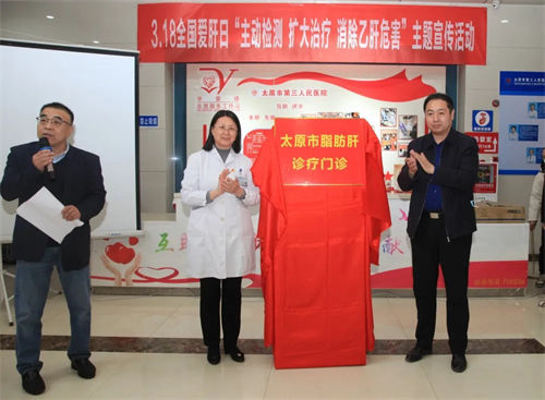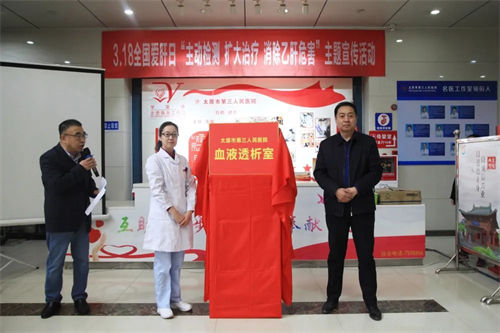 活動首先由院長馬建中分別與肝病一科馮亦農主任、血液透析室肖青主任為“太原市脂肪肝診療門診”與“血液透析室”揭牌,副院長周宏講話。