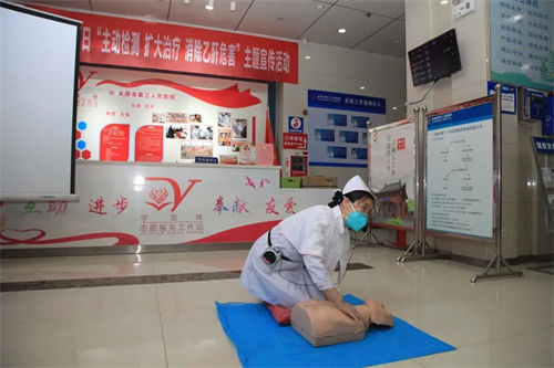 由肝病三四科護理單元護士李婷帶來的“人人學急救、急救為人人”心肺復蘇現(xiàn)場演示,用生動直觀的形式,幫助大家學會了日常的急救小常識。
