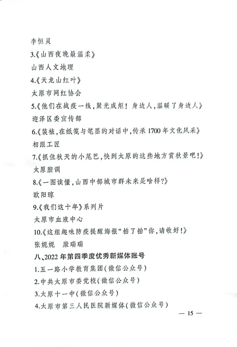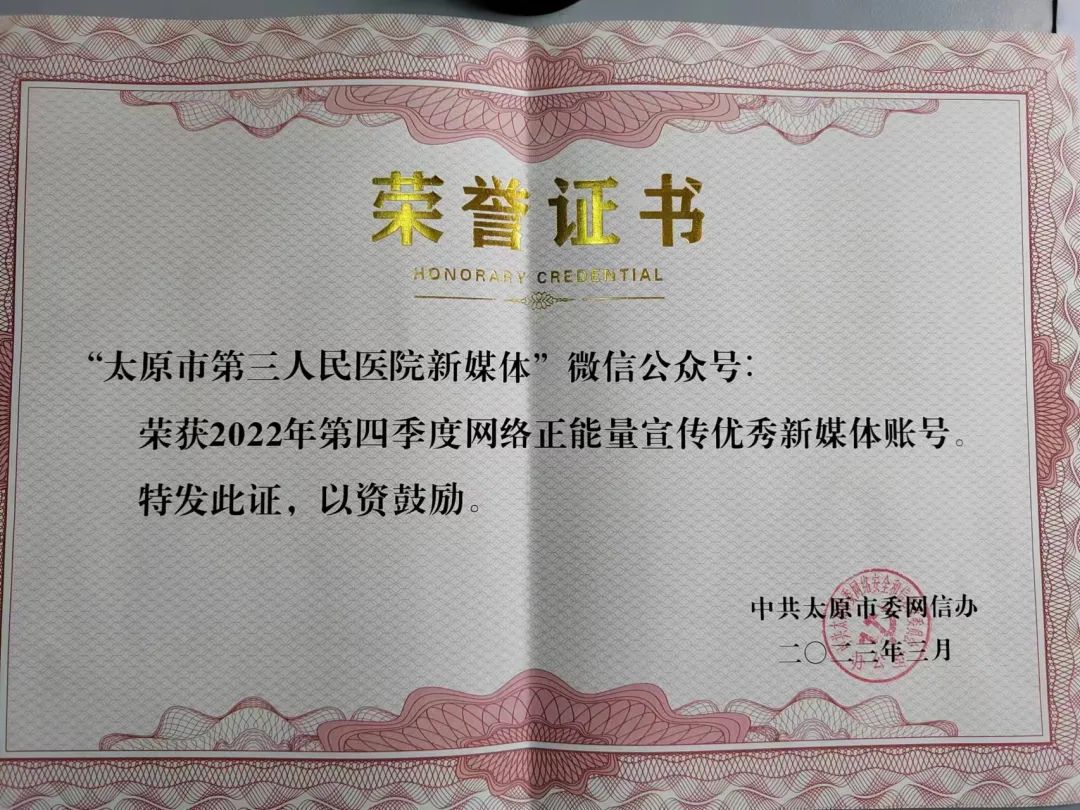 近日,“太原市第三人民醫(yī)院新媒體”微信公眾號(hào)榮獲中共太原市委網(wǎng)信辦表彰“2022年第四季度網(wǎng)絡(luò)正能量宣傳優(yōu)秀媒體賬號(hào)”稱(chēng)號(hào)。