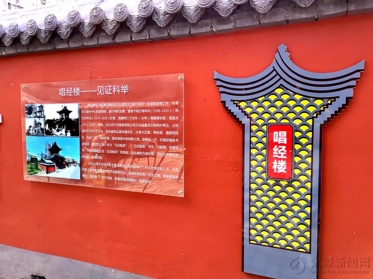 唱經樓坐落于太原市中心的鼓樓街中段,是明清時期科舉文化遺存中為數不多的一處宣唱金榜之所,亦是太原市“科舉文化博物館”。據清道光《陽曲縣志》記載,唱經樓始建于明代初期,現存建筑以唱經樓為主,與正殿、春秋樓、通廊相組合,構成一“工”字型院落。2013年3月,唱經樓被國務院公布為第七批全國重點文物保護單位。