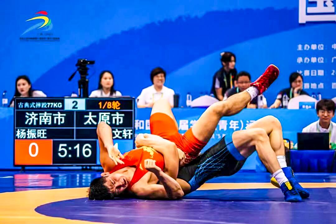 11月9日,第一屆全國學生(青年)運動會古典式摔跤77公斤級比賽完美收官。太原市運動員苗舜昱、王文軒分別擊敗武漢的王其寶和北京朝陽的瓦吉提·賽買提,成功會師決賽,太原隊提前鎖定該項目金牌。最終苗舜昱奪得金牌,這也是太原代表團在“學青會”上奪得的第11枚金牌。特派記者 宿曉健 攝影報道
