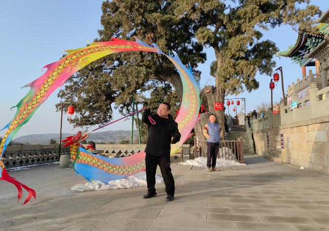 金色陽光下,李克頌和朋友們從背包里拿出五彩斑斕的健身長龍,在龍山昊天觀前寬闊的平臺上慢慢舞動起來。威風凜凜的“巨龍”在大伙兒的手里上下翻飛、左右騰挪,時而騰云駕霧,時而下潛深海;五光十色的龍身隨著龍頭翩翩起舞,在云霧里、深海中翻轉舞動,似彩練當空舞、嫦娥舒廣袖,蔚為壯觀。他們的精彩表演,吸引來許多登山晨練、賞景的市民和游客駐足觀賞、拍照。