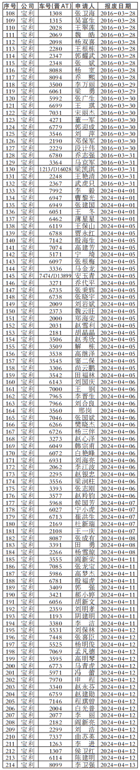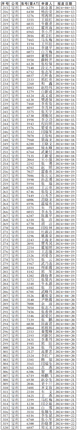 按照《太原市客運出租汽車服務管理條例》等有關規定,我公司對提出車輛更新申請的巡游出租汽車經營者申報材料進行了核實,現對符合條件的經營者名單(第一批426人)予以公示,公示期為2024年4月10日-2024年4月14日,公示期間,若巡游出租汽車經營者及社會各界對上述車輛經營者資格有異議,均可來電反映。