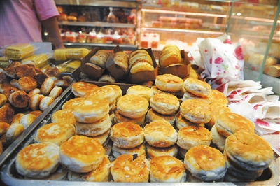 美食街桃園二巷里,徐文林香酥餅店人氣最旺,無論上午還是下午,櫥窗前總是排著一字長蛇陣,數年如一日。店內,老板徐文林正指導面點師揉面、包餡,講解精煉細致。幾個服務員則忙著烘烤、稱重。長條的是棗泥味、方形的是椒鹽味、圓形的是五仁味,當香酥餅出鍋時,酥皮金黃,香氣四溢,讓人垂涎欲滴。輕輕咬上一口,層次分明、酥脆適口的點心在舌尖舞蹈,通過牙齒的咀嚼,油酥的香氣在口腔中激發,現代人的胃口依然會被傳統的美味俘獲,這是山西手工制酥做餅的魔力。
