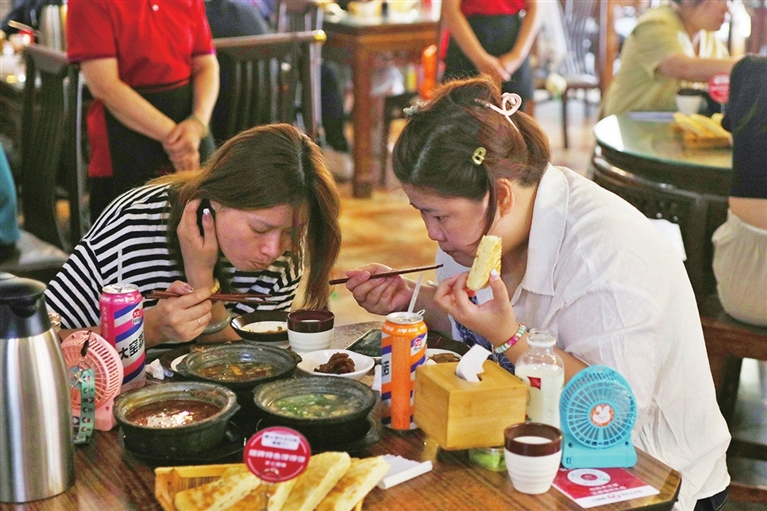 火鍋翻滾,熱氣騰騰。店里也不乏年輕顧客。剛參加工作的楊雯雯,周末下班后,驅(qū)車半個(gè)多小時(shí),帶著幾位同事來(lái)到這里。“我要砂鍋燴菜”“我要砂鍋紅燒肉”“給我來(lái)一份招牌番茄豆腐”……大家圍坐,眼神里滿是期待。隨著不同口味的砂鍋端上桌,這些年輕人迫不及待地拿起筷子。食物送入口中,滿足的神情瞬間綻放,燙得直吹氣,筷子卻還是停不下來(lái)。他們一邊品嘗著美味,一邊分享著彼此的趣事,歡聲笑語(yǔ)不斷。