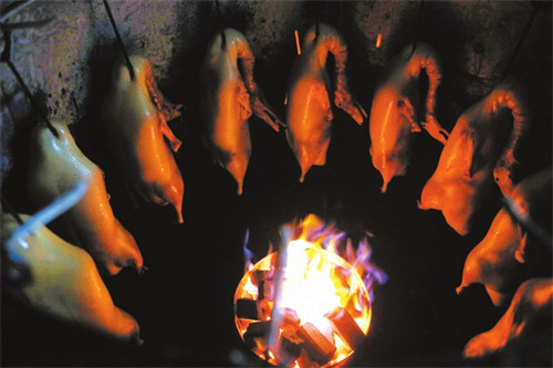 說話間他低頭看了一眼時間,便趕緊將到點的烤鴨從熱浪騰起的爐子中摘了出來。隨著抖動,鴨子被烤出的熱油間或落下,滴濺在爐底燃燒的炭火上,冒起陣陣誘人的“滋啦”聲。