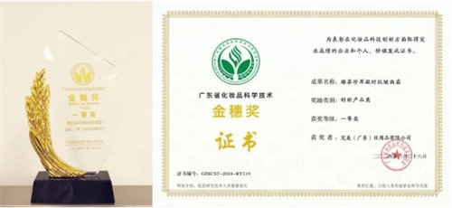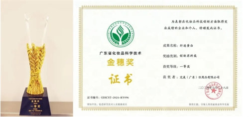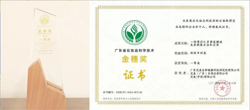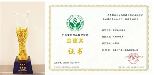金穗獎是由廣東省化妝品科學技術研究會主辦,為鼓勵廣大科技工作者積極投身科學實踐、繁榮科技學術交流、推動化妝品科技創新而設立,在創新原料、創新產品、創新專利方面分別設有“化妝品科學技術創新獎”獎項,在業界具有極高的認可度。