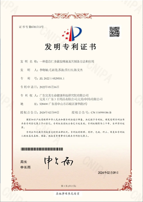 目前,薏苡仁發酵液原料技術已獲國家發明專利授權(一種薏苡仁發酵液及其制備方法和應用,專利號:ZL 2022 1 0529551.1)。