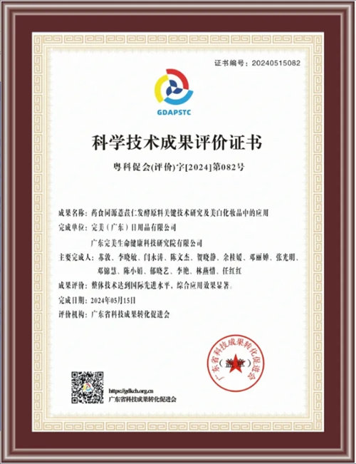 “藥食同源薏苡仁發酵原料關鍵技術研究及美白化妝品中的應用”科技成果評價結論為:整體技術達到國際先進,綜合應用效果顯著。并應用于完美“臻薈珍萃雪肌系列”護膚新產品中。