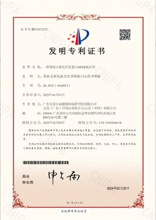 纖連蛋白原料技術已獲國家發明專利授權(一種重組人源化纖連蛋白rhFEB及應用,專利號:ZL 2023 1 0642873.1)。