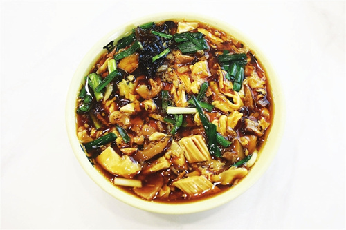 陽(yáng)光小館的當(dāng)家菜還有北郊辣豆腐。豆腐這種簡(jiǎn)單的食材,想做出讓人難忘的味道實(shí)為不易。傳統(tǒng)鹵水豆腐切片、干辣椒少許、水淀粉適量,再輔以幾樣簡(jiǎn)單的調(diào)味燒制,花椒水提味,出鍋前淋入少許水淀粉勾上薄芡,翻拌均勻,一盤鮮香微辣的辣豆腐就出鍋了。這道菜營(yíng)養(yǎng)美味更健康,是道非常不錯(cuò)的下飯菜,有時(shí)候甚至比大魚大肉都受歡迎。